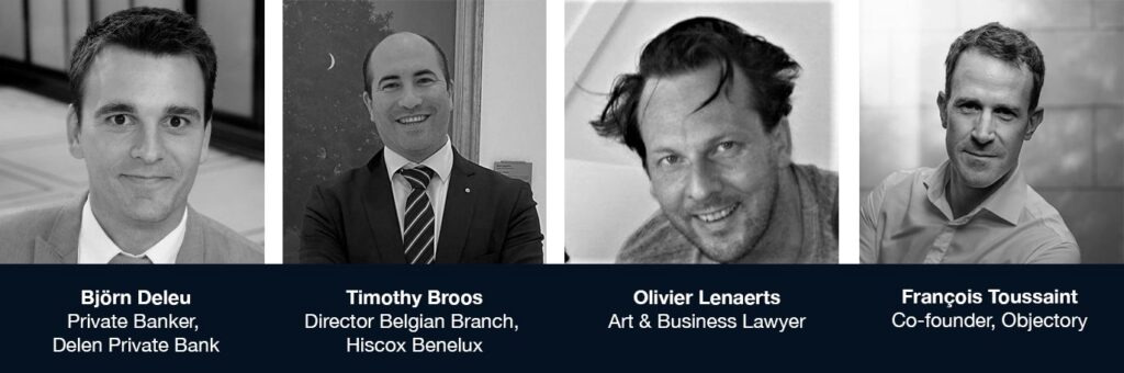 Talk with Timothy Broos (Director Belgian Branch, Hiscox Benelux), Björn Deleu (Private Banker, Delen Private Bank), Oliver Lenaerts (Specialist in Art and Business Law) & François Toussaint (Co-founder of Objectory).