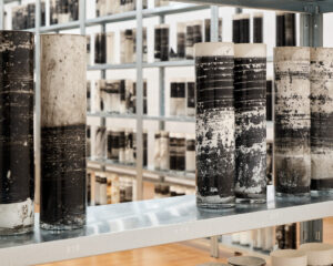 As part of its participation in EUROPALIA ESPAÑA, the Boghossian Foundation presents Biblioteca Nacional, an exhibition designed with Elsa Paricio. For the first time in Belgium, the Spanish artist showcases a corpus of works unfolding in the Project Space of the Villa Empain. The original scenography conceived for the exhibition revolves around the monumental work Biblioteca Nacional (2018–2025). The fruit of six years of work, this project led Elsa Paricio to disseminate glass cylinders filled with a mixture of India ink and water across landscapes, abandoned factories, deserted houses, and natural sites in Spain. Fragile and exposed to the elements, these objects underwent a slow process of evaporation in contact with time and light, becoming silent witnesses of their environment. Their surfaces, marked with lines of ink and dust, record the traces of a memory in the making. True ‘landscape-objects’, the cylinders compose a fragmented and poetic national library, where intimate memory and collective identity intertwine.