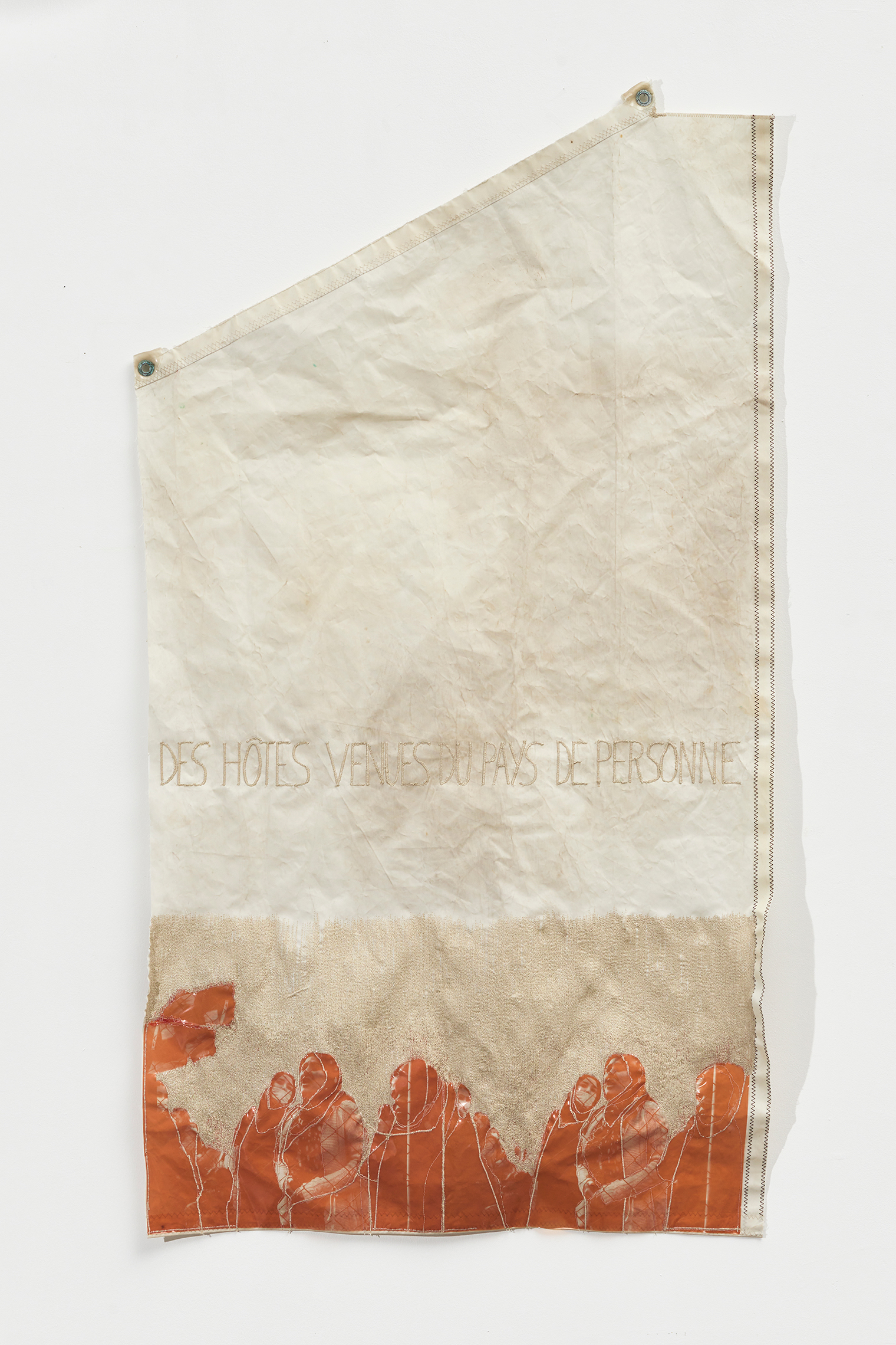 Boat sail, vinyl print image, machine stitching, Hannah Arendt quote
