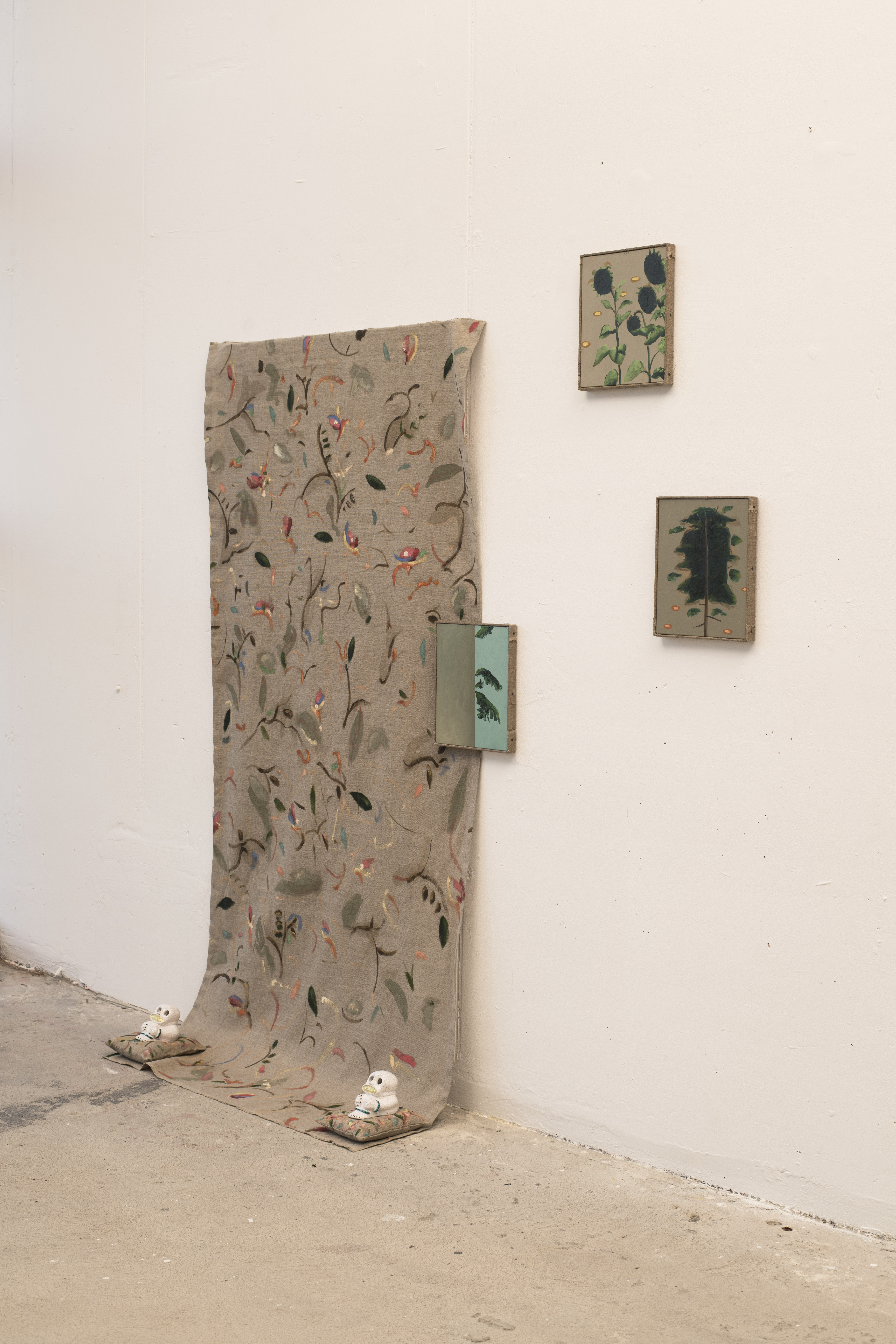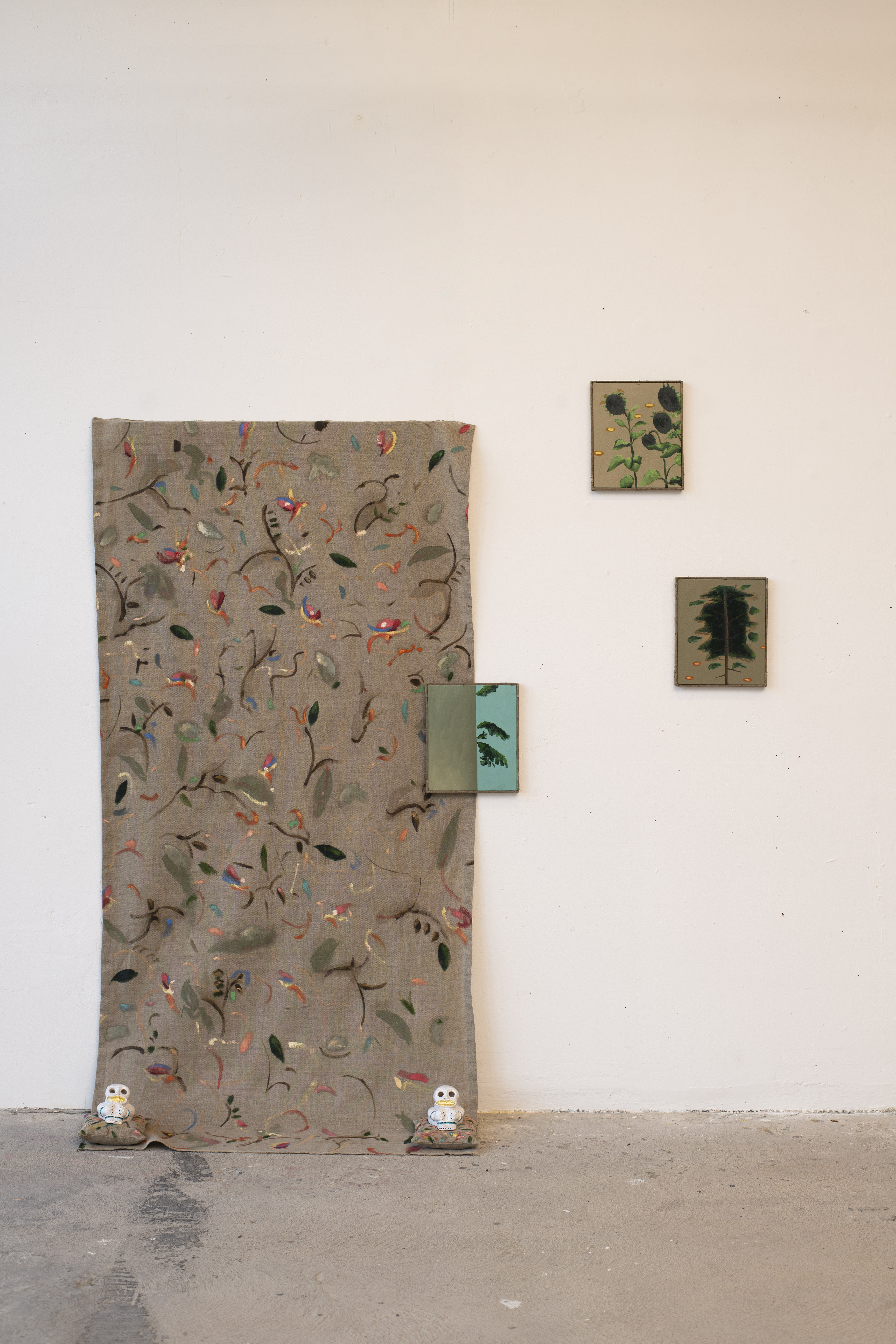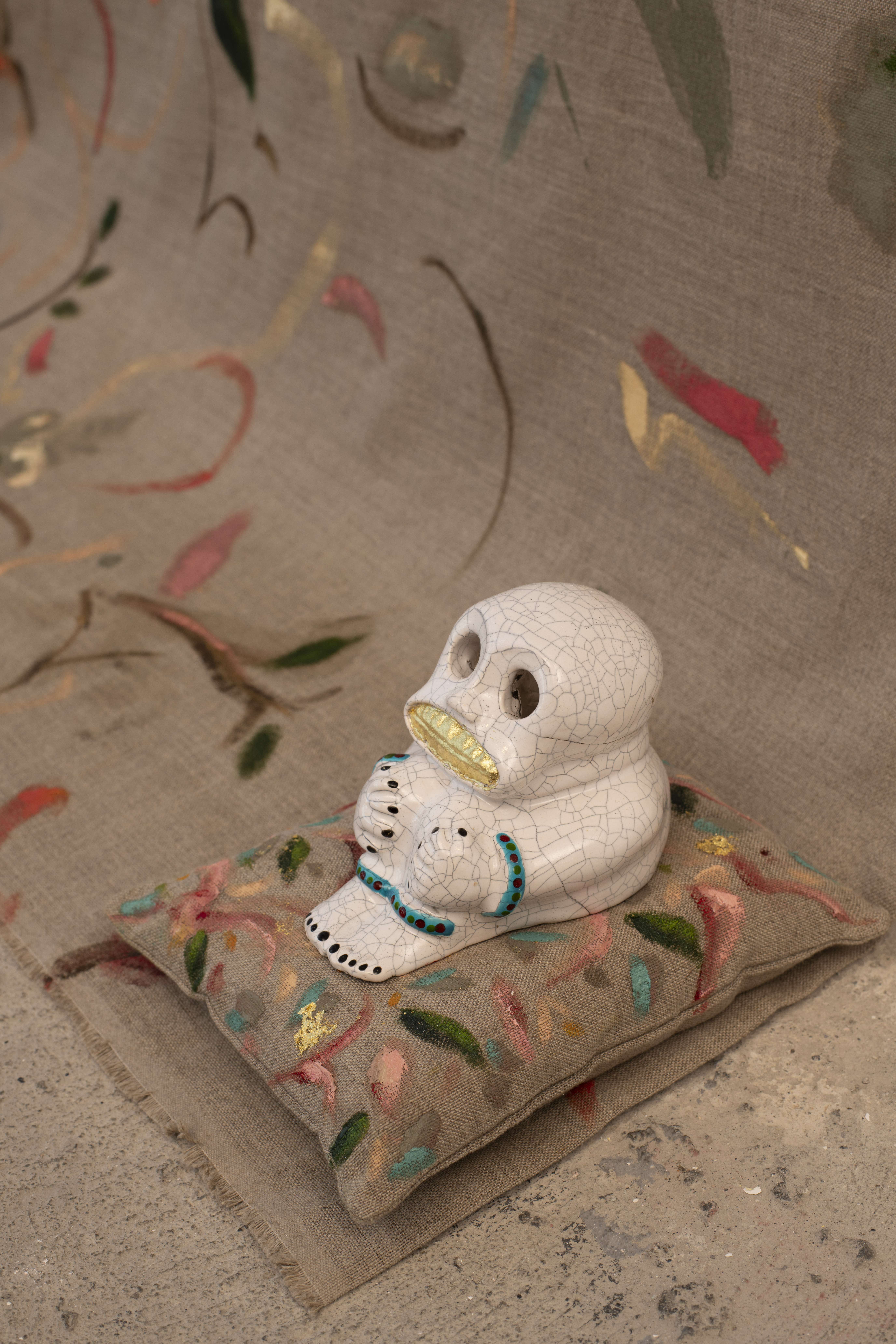 Oil on linen, artist’s linen frame, glazed ceramic grinners
