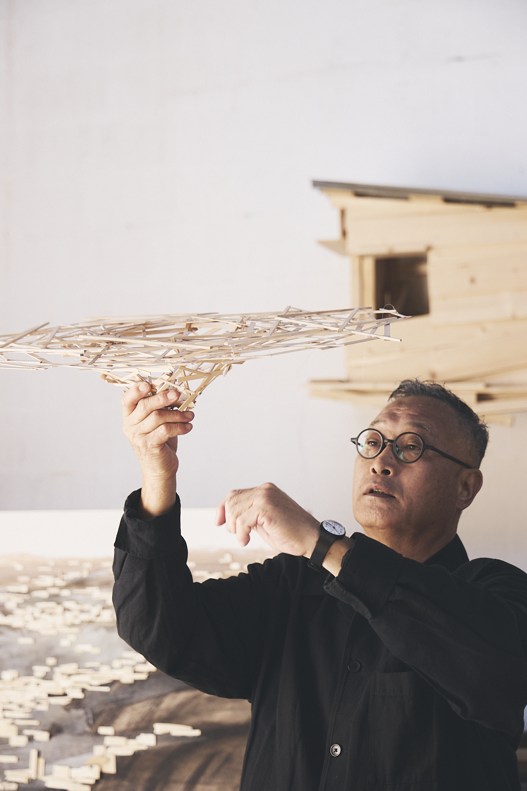 Born in 1953 in Hokkaidō, Japan, Tadashi Kawamata lives and works in Tokyo and Paris. Growing up in the mountains on the island of Hokkaidō, he dreamed of the bustle and dynamism of the city. At the crossroads between art, architecture and design, his work explores the environmental impacts of reusing materials. Renowned for his in-situ installations built from planks, chairs and barrels, the artist challenges our attachment to the permanence of things, which is constantly questioned by forces of nature. His belvederes, footbridges, fragile piles and shelters are designed to be experienced, inviting us to change our perspective on the places that hosts them and their impermanence.