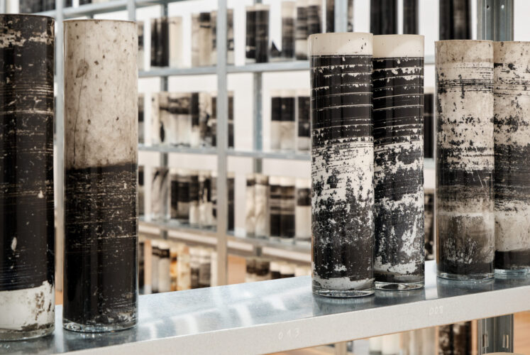 As part of its participation in EUROPALIA ESPAÑA, the Boghossian Foundation presents Biblioteca Nacional, an exhibition designed with Elsa Paricio. For the first time in Belgium, the Spanish artist showcases a corpus of works unfolding in the Project Space of the Villa Empain. The original scenography conceived for the exhibition revolves around the monumental work Biblioteca Nacional (2018–2025). The fruit of six years of work, this project led Elsa Paricio to disseminate glass cylinders filled with a mixture of India ink and water across landscapes, abandoned factories, deserted houses, and natural sites in Spain. Fragile and exposed to the elements, these objects underwent a slow process of evaporation in contact with time and light, becoming silent witnesses of their environment. Their surfaces, marked with lines of ink and dust, record the traces of a memory in the making. True ‘landscape-objects’, the cylinders compose a fragmented and poetic national library, where intimate memory and collective identity intertwine.