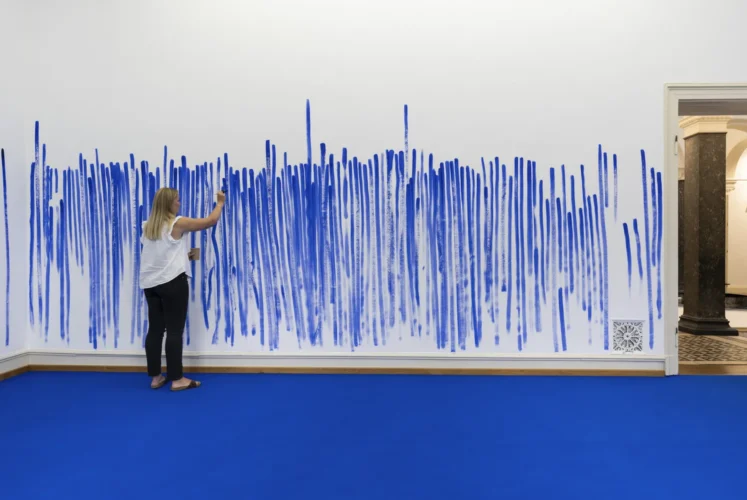 At the heart of the exhibition lies Breathe With Me, a large-scale participatory artwork that invites visitors to paint their own breath. Each exhale is translated into a simple blue line on the canvas walls — one line per breath. Over time, these individual gestures accumulate into a collective drawing: a shared portrait of presence, mindfulness, and connection.